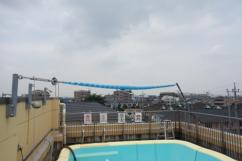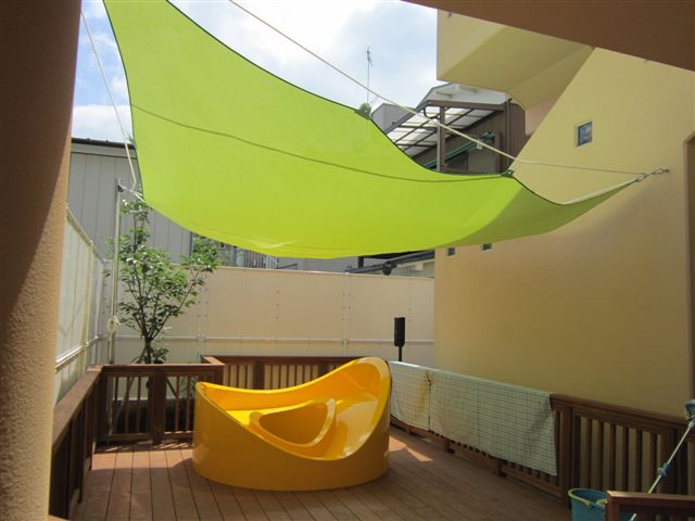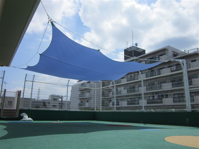 日除けシェード 保育施設等での紫外線対策に。 夏場の園庭で元気に走り回る子供たち。でも紫外線や暑さによる熱中症対策は大丈夫でしょうか? そんな場所に、UVをカットし熱を反射・吸収する効果があり、また通気性でたまった熱を逃がす日差し除けシェードは欠かせません。